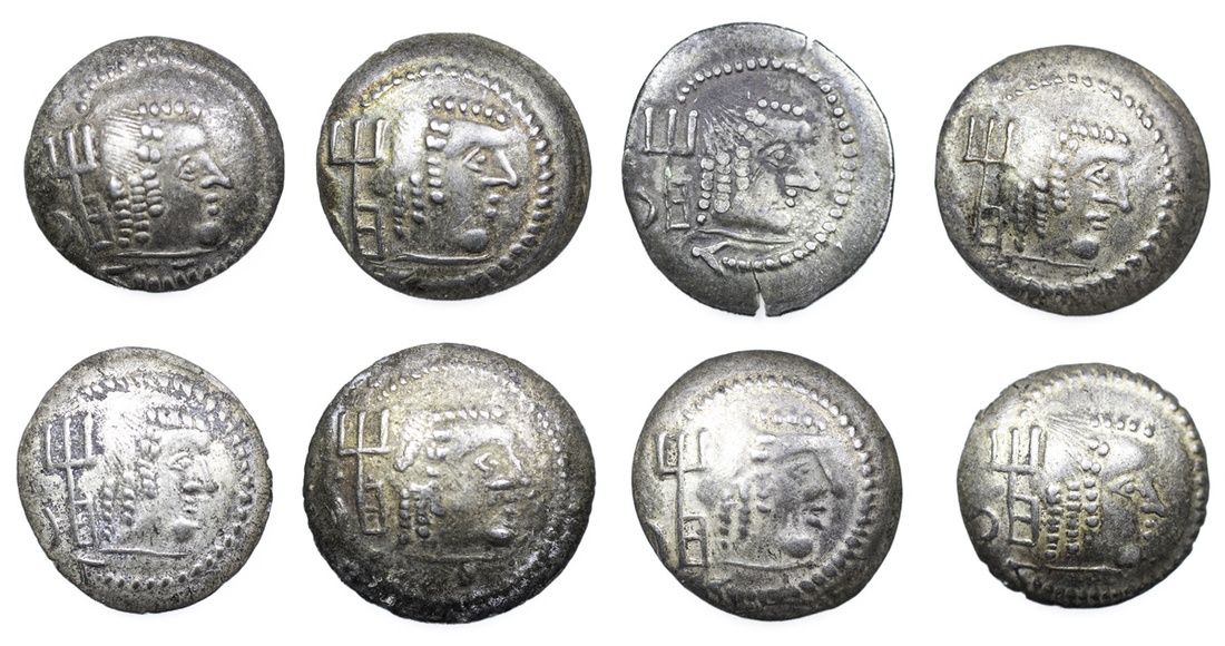 (x) Felix Arabia, Himyarites, temp. Amdan Bayyin, AR Quinarii, Raidan, struck c. AD 80-100, male head right, trident and monogram behind, surrounded by torc, rev. small male head right surrounded by Sabaean inscription and monogram, (SNG ANS 1595ff.), ranging from good fine to extremely fine; (8)