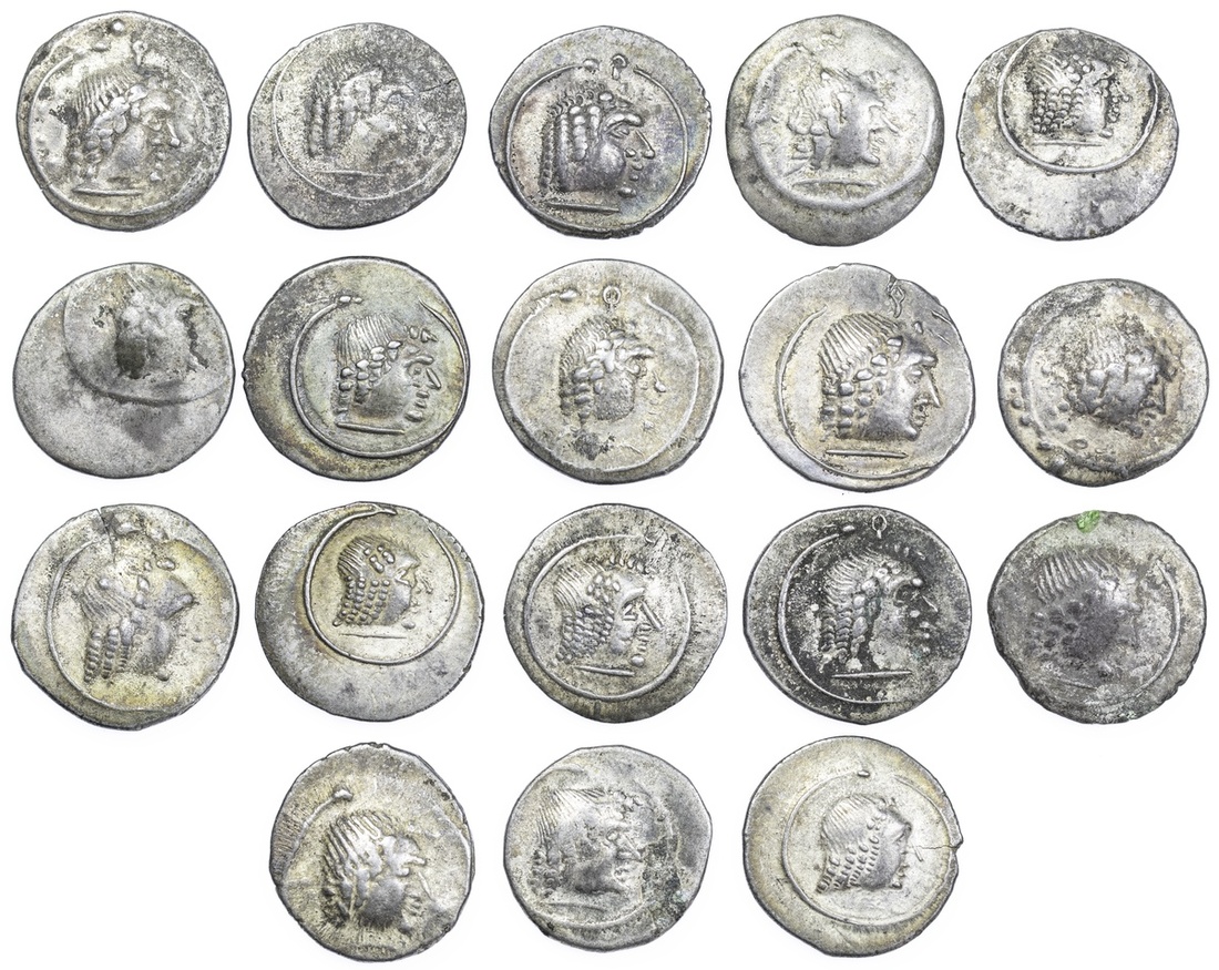 (x) Felix Arabia, Himyarites, temp. Amdan Bayyin, AR Quinarii, Raidan, struck c. AD 80-100, male head right, surrounded by torc, rev. small male head right surrounded by Sabaean inscription and monogram, ranging from good fine to extremely fine (18)