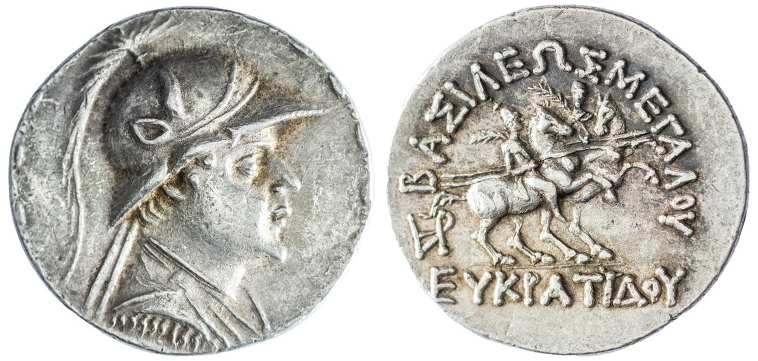 Kingdom of Baktria, Eukratides I Megas (c. 171-135 BC), AR Tetradrachm, diademed and draped bust right, wearing crested helmet ornamented with ear and horn of bull, rev. BASILEOS MEGALOY, Dioskouri on horseback prancing right, each holding sceptre and palm, monogram to left, EUKRATIDOY in exergue, 16.97g (Bopearachchi 6Z; Mitchiner 177l; SNG ANS 473 var. (placement of rev. monogram); HGC 12, 131), slightly granular surface, light tone, good very fine or better