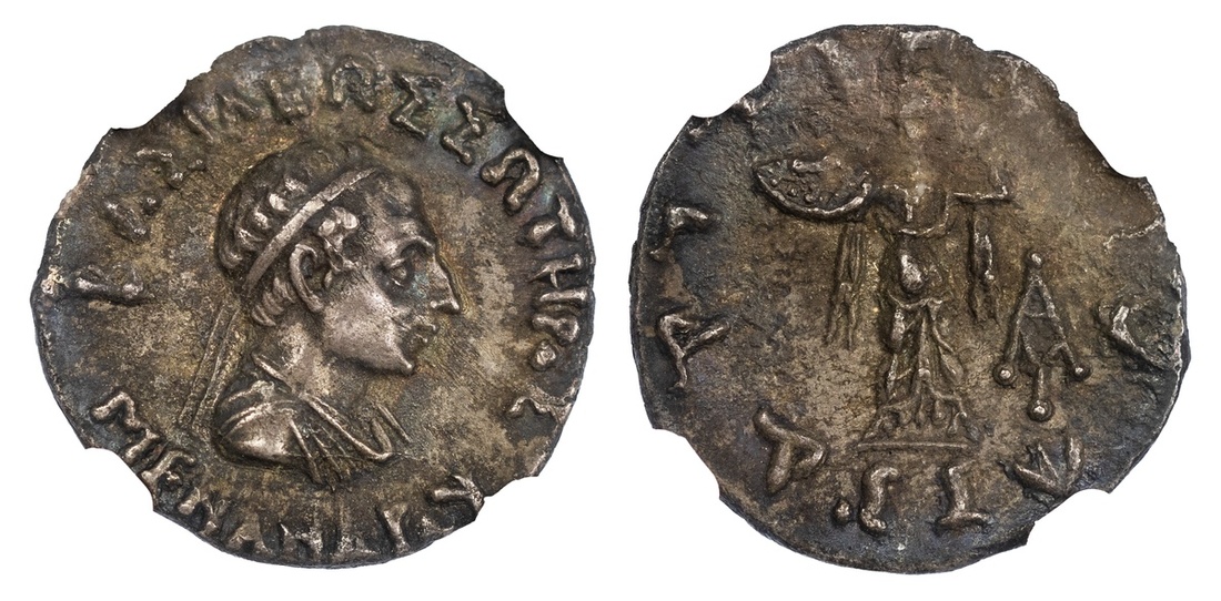 NGC Ch VF | Indo-Greek Kingdom, Menander I Soter (165/55-130 BC), AR Drachm, BASILEOS SOTIROS MENANDROY, diademed and draped bust right, rev. Kharoshti legend surrounds Athena Alkidemos advancing left, brandishing shield and thunderbolt, monogram to left field (Bopearachchi 12; SNG ANS 764) exceptional portrait, good very fine, in an NGC 'Ancients' holder, graded Choice Very Fine ~ edge chip, Cert. #6133202-386