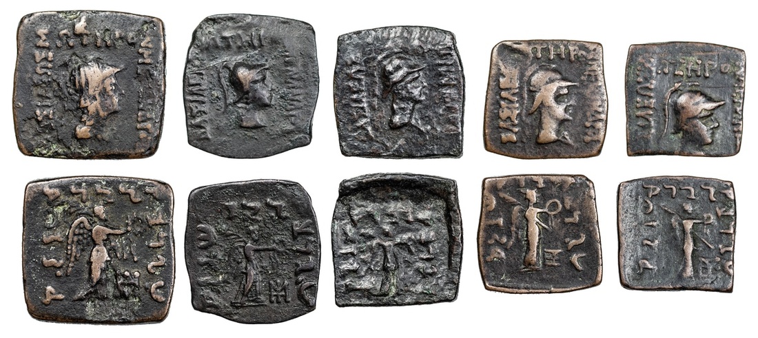 Indo-Greek Kingdom, Menander I Soter (165/55-130 BC), a Selection of Bronze (5): all with helmeted and draped bust right, rev. Nike advancing right, i) larger type, 10.32g (HGC 12, 200), very fine; and smaller types (4): ii) 5.97g; iii) 4.52g; iv) 4.35g; v) 6.13g (HGC 12, 212), ranging from good fine to very fine (5).
