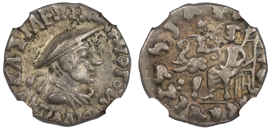 NGC VF | Indo-Greek Kingdom, Antialkidas Nikephoros (c. 130-120 BC), AR Drachm, diademed and draped bust right, wearing kausia, rev. Zeus Nikephoros enthroned left, forepart of elephant right, holding wreath in its trunk, monogram below throne (HGC 12, 259), about very fine, NGC Cert. #6133202-411