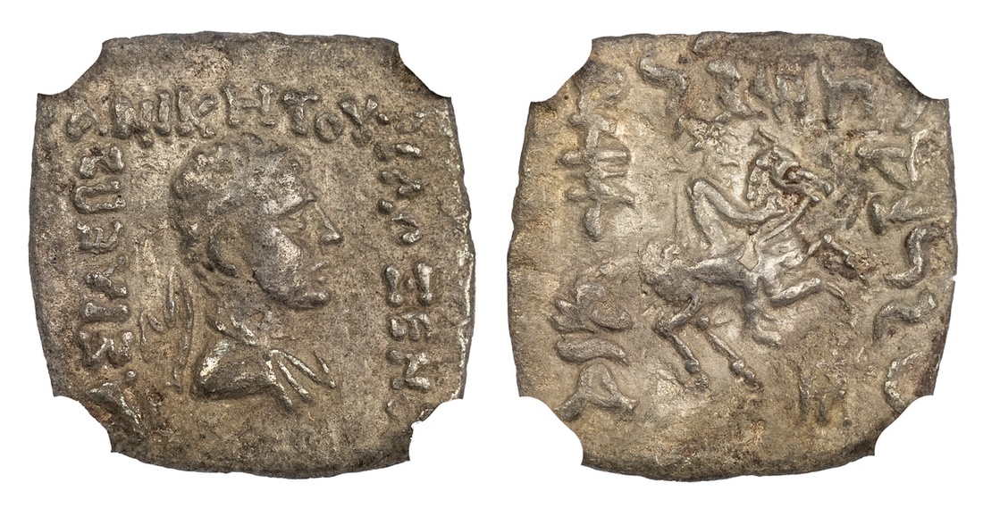 NGC VF | Indo-Greek Kingdom, Philoxenos (c. 125-110 BC), AR Square Drachm, diademed and draped bust right, rev. Philoxenos in military attire, on horse rearing right, monogram to lower right (SNG ANS 1170; HGC 12, 271), toned, very fine