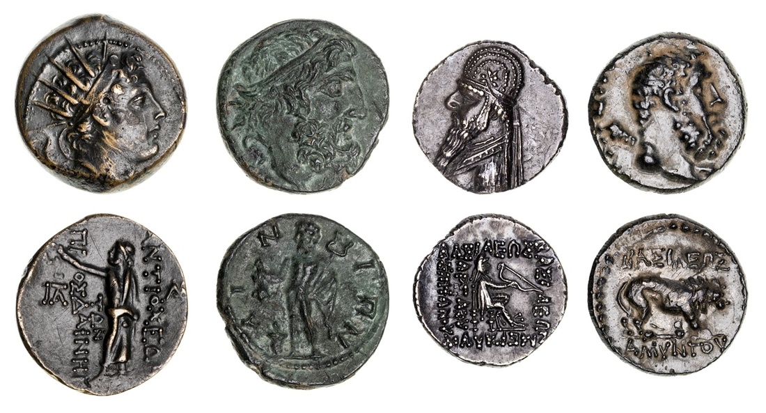 a Selection of Hellenistic Bronze (4): i) Thrace, Ainos, AE Unit, c. 100-100 BC, diademed head of Poseidon right, rev. AIN ION, Hermes standing left, holding kerykeion and purse over flaming altar to left, 5.66g (SNG ANS 423), green patina, slightly worn, fine and rare nevertheless; ii) Galatia, Amyntas (36-25 BC), bearded head of Herakles right, club over shoulder, rev. BASILEOS AMYNTOY, lion standing right, 5.60g (RPC I 3502; HGC 7, 781), toned, very fine; iii) Seleukid Kingdom of Syria, Antiochos IV Epiphanes (175-164 BC), AE, Anthioch, quasi-municipal coinage, c. 169-164, radiate and diademed head right, rev. ANTIOXEON TON PROS DAPHNI, Zeus standing left, holding wreath, monograms to outer fields, 8.78g (SC 1416.3; HGC 9, 656), lovely tone, good very fine; iv) Kingdom of Parthia, Mithradates II (c. 96-92 BC), AR Drachm, Ekbatana (?), diademed and draped bust left, wearing tiara decorated with six-rayed star, with ear flap, long beard, and torque ending in seahorse, rev. BASILEOS BASILEON MEGALOY ARSAKOY EPIPHANOUS, archer (Arsakes I) seated right on throne, holding bow, 4.13g (Sellwood 28.3; Sunrise 298), darkly toned, good very fine or better