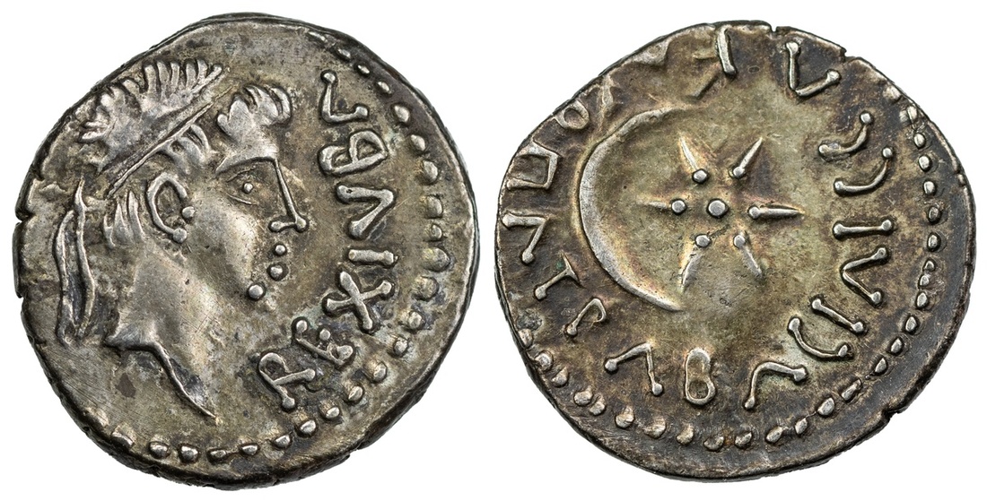 Kingdom of Mauretania, Juba II (25 BC-AD 23), with Cleopatra Selene II, AR Denarius, Caesarea Mauretaniae, struck c. 19 BC-AD 6, REX JVBA, diademed head right, rev. BASILISSA KLEOPATRA, star and crescent, 3.13g (SNG Copenhagen 567; Mazard 299), attractively toned, struck slightly off-centre but otherwise good very fine to extremely fine