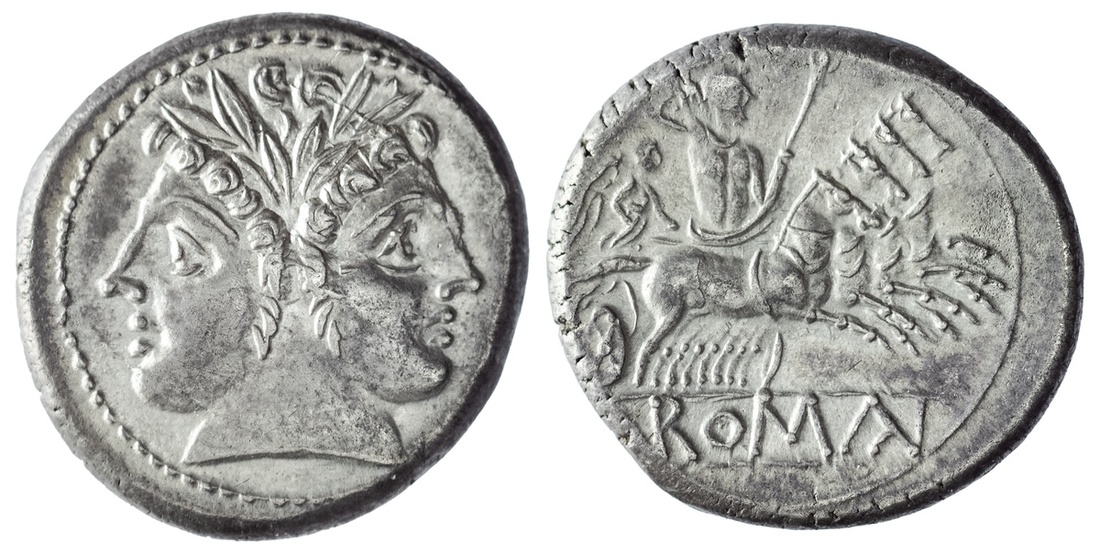 Roman Republic, Anonymous, AR Quadrigatus, struck c. 225-212 BC, laureate heads of Janus, rev. Jupiter, hurling a thunderbolt and brandishing a sceptre, in galloping quadriga driven by Victory, right, incuse ROMA inscribed upon raised tablet in exergue, 6.45g (Crawford 28/3; Sydenham 64; HN Italy 334; RSC 23; RBW 63), struck upon a compact flan, lovely style, slight die flaw to obverse with strike off-centre to reverse, but otherwise good very fine to near extremely fine