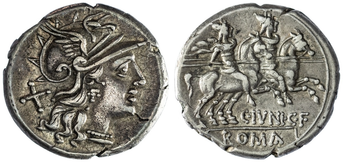Roman Republic, C. Junius C. f., AR Denarius, struck 149 BC, head of Roma right, wearing winged helmet, X behind, rev. the Dioscuri galloping right, C. IVNI. C. F. below, ROMA on partial tablet in exergue, 3.89g (Crawford 210/1; Sydenham 392; BMC 660; RSC 1), toned and residually lustrous, lovely portrait, good very fine or better