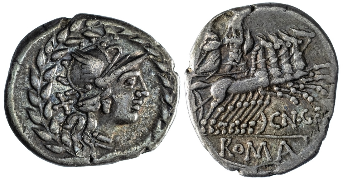 Roman Republic, Cn. Gellius, AR Denarius, c. 138 BC, head of Roma right, wearing winged helmet, earring and necklace, X behind, all within laurel border, rev. Mars driving quadriga right, holding shield and grasping captive Nerio, CN G[EL] below, ROMA in exergue, 3.61g (Crawford 232/1; Sydenham 434), toned, slightly off-centre but otherwise  good fine to very fine