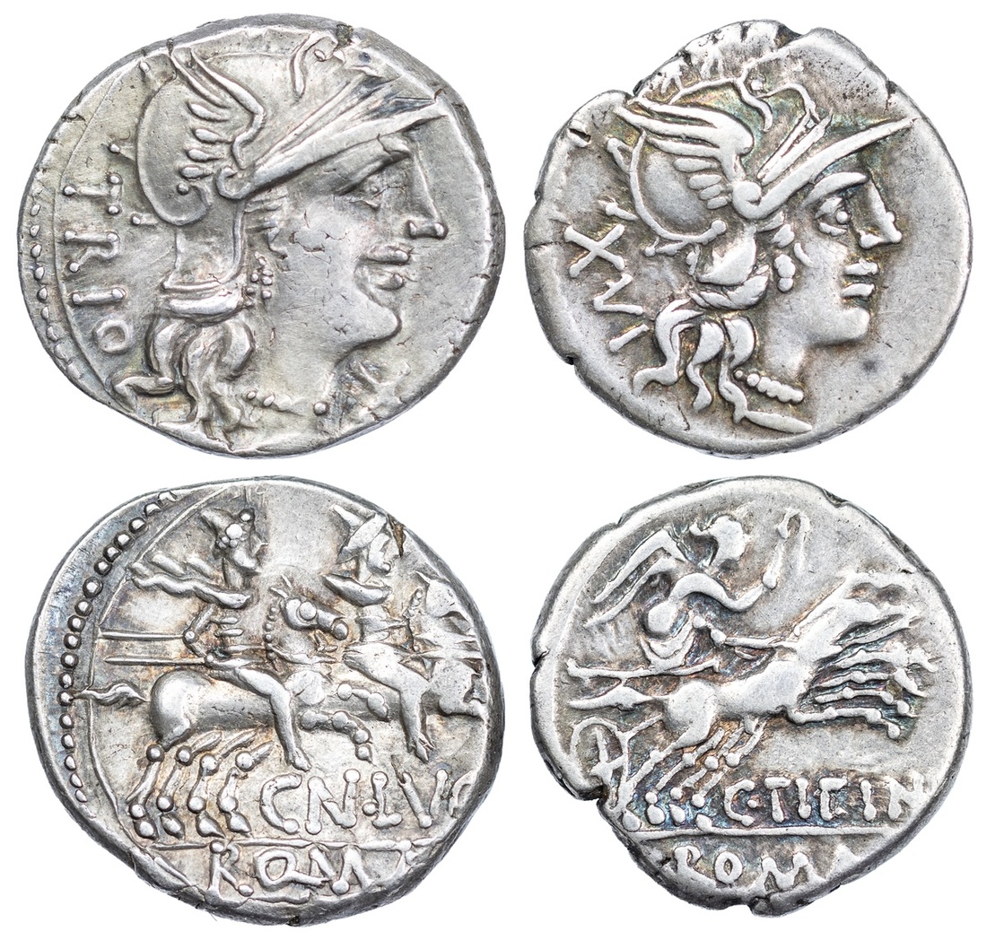 Roman Republic (2): i) Cn. Lucretius Trio, AR Denarius, 136 BC, TRIO, head of Roma right, wearing winged helmet, X before, rev. Dioscuri galloping right, CN LVCR below, ROMA in exergue, 3.83g (Crawford 327/1a; Sydenham 430), toned, good very fine; ii) C. Titinius, c. 141 BC, head of Roma right, wearing winged helmet, XVI behind, rev. Victory driving galloping biga right, holding whip and reins, C. TITINI below, ROMA in exergue, 3.58g (Crawford 226/1a; Sydenham 445), good fine to very fine, toned; (2)