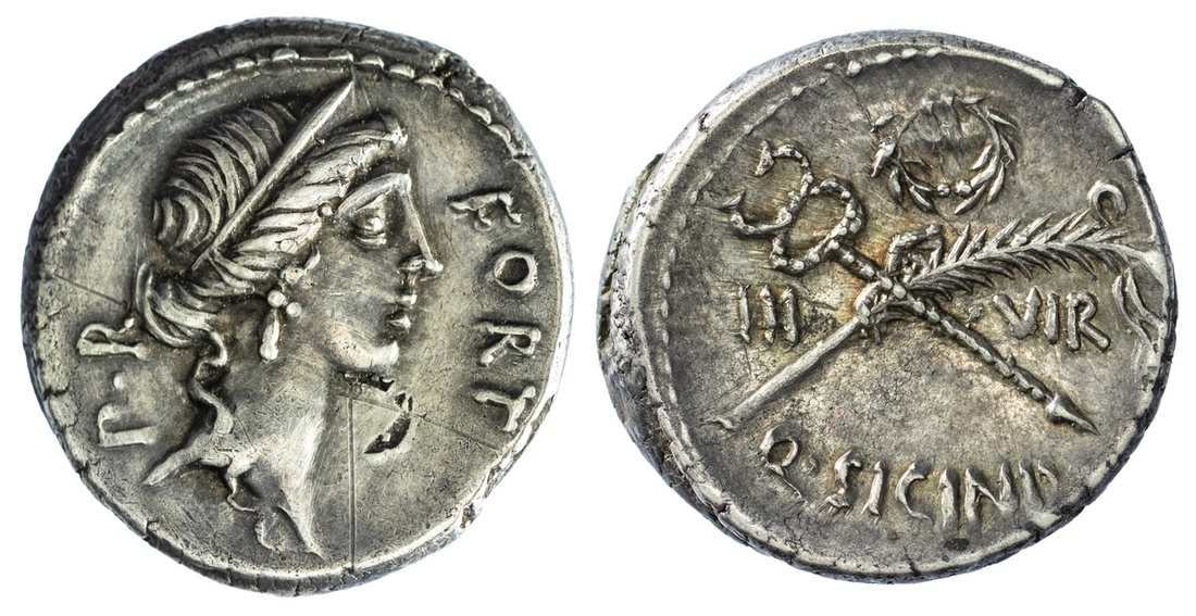 Roman Republic, Q. Sicinius, as Moneyer, AR Denarius, struck early 49 BC, FORT P R, diademed head of Fortuna Populi Romani right, rev. palm frond and winged caduceus, bound with fillet, in saltire, filleted wreath above, III-VIR across fields, Q SICINIV[S] below, 4.11g (Crawford 440/1; Sydenham 938; RBW 1555), scratches, lustrous, good very fine