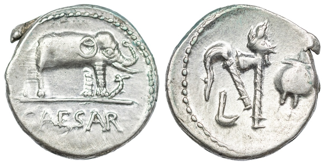 Roman Republic, Julius Caesar, AR Denarius, Military mint travelling with Caesar in North Africa, struck April-August 49 BC, elephant advancing right, trampling horned serpent, countermarked to elephant's shoulder, CAESAR in exergue, rev. emblems of the pontificate: simpulum, aspergillum, securis, and apex, 3.72g (Crawford 443/1; RBW 1557; RSC 49), some wear to lower part of obverse, otherwise good very fine