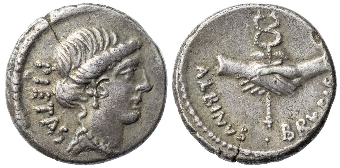 Roman Republic, D. Junius Brutus Albinus as Moneyer, AR Denarius, struck 48 BC, PIETAS, head of Pietas right, rev. two clasped hands around winged caduceus, ALBINVS BRV[TI F] below, 3.97g (Crawford 450/2; Sydenham 942; RBW 1577), slightly granular surfaces with a cut to edge, struck slightly off-centre to reverse, nevertheless toned and about very fine