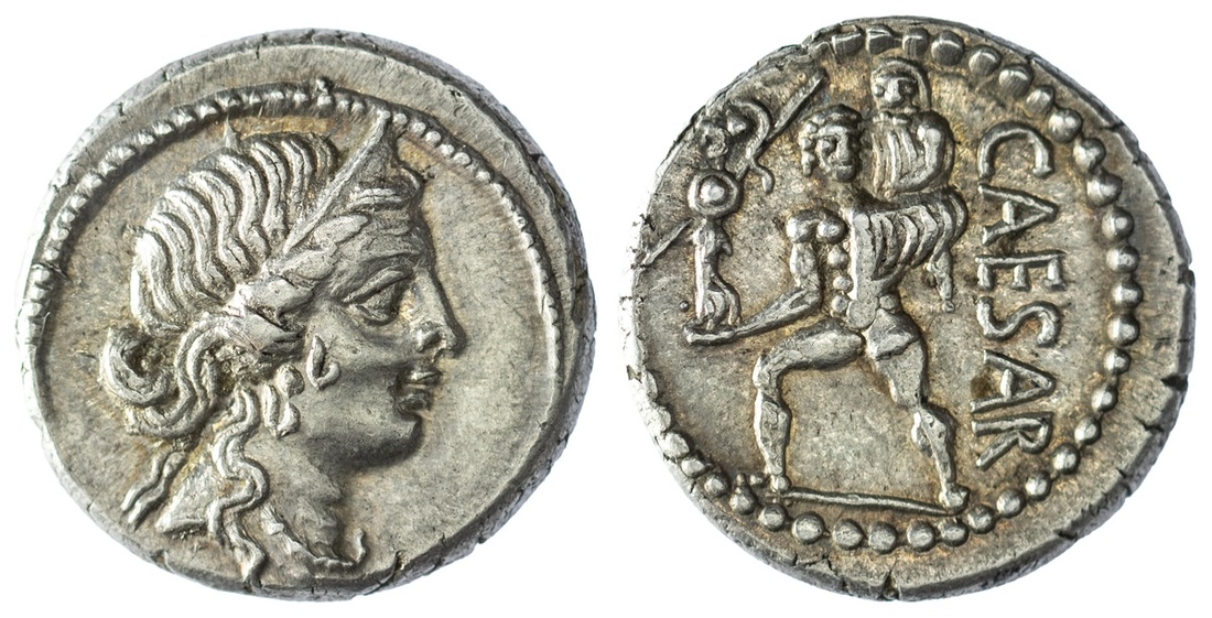 Roman Republic, Julius Caesar, AR Denarius, Military mint traveling with Caesar in North Africa, struck c. 48-46 BC, diademed head of Venus right, rev. CAESAR, Aeneas advancing left, holding Palladium in his right hand and bearing his father Anchises on his left shoulder, 3.92g (Crawford 458/1; Sydenham 1013), residually lustrous and lightly toned, lovely details and a well-rendered reverse showcasing the founding myth of the Eternal City, extremely fine