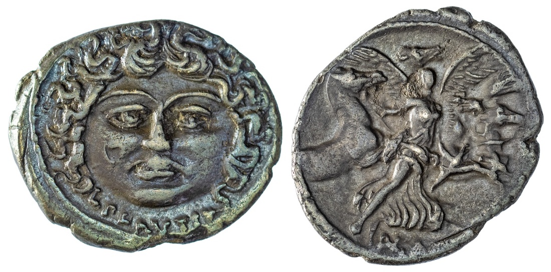 Roman Republic, L. Plautius Plancus, AR Denarius, struck 47 BC, facing mask of Medusa with disheveled hair, L PLAVTIVS below, rev. PLANCV[S?], Victory (or Aurora) flying orward, head left, holding palm branch in left hand over shoulder, reins in both hands, leading the four horses of the sun sharging right, (Crawford 453/1b-c; Sydenham 959a), softened, but with nice dark tone, good fine to very fine