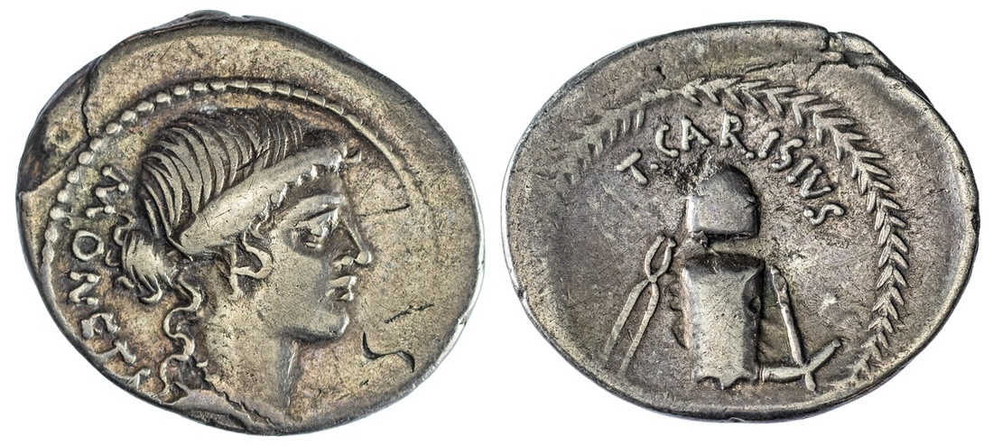 Roman Republic, T. Carisius, AR Denarius, struck 46 BC, head of Juno Moneta right, one lock of hair on neck, rev. T CARISIVS, implements for coining money: anvil die with garlanded punch die above, tongs and hammer on either side, all within laurel wreath, 3.89g (Crawford 464/2; Sear, Imperators 70; Sydenham 982a; Carisia 1a; RBW 1614), about very fine