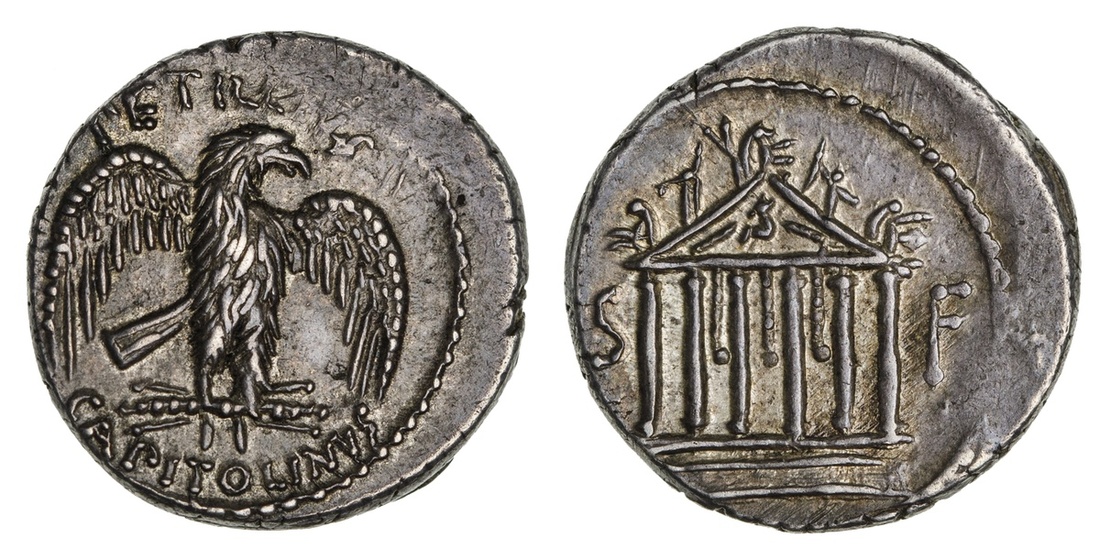 (x) Roman Republic, Petillius Capitolinus, AR Denarius, struck 43 BC, eagle standing facing on thunderbolt with wings spread, head right, PETIL[LIVS] above, CAPTOLINI below, all within dotted border, rev. Temple of Jupiter Capitolinus, richly decorated hexastyle temple with three garlands hanging between columns, the pediment ornamented with armed figures, with a seated figure of Jupiter between two other figures atop the tympanum, 3.86g (Crawford 487/2a), struck slightly off-centre, nevertheless attractively toned and detailed, good very fine or better