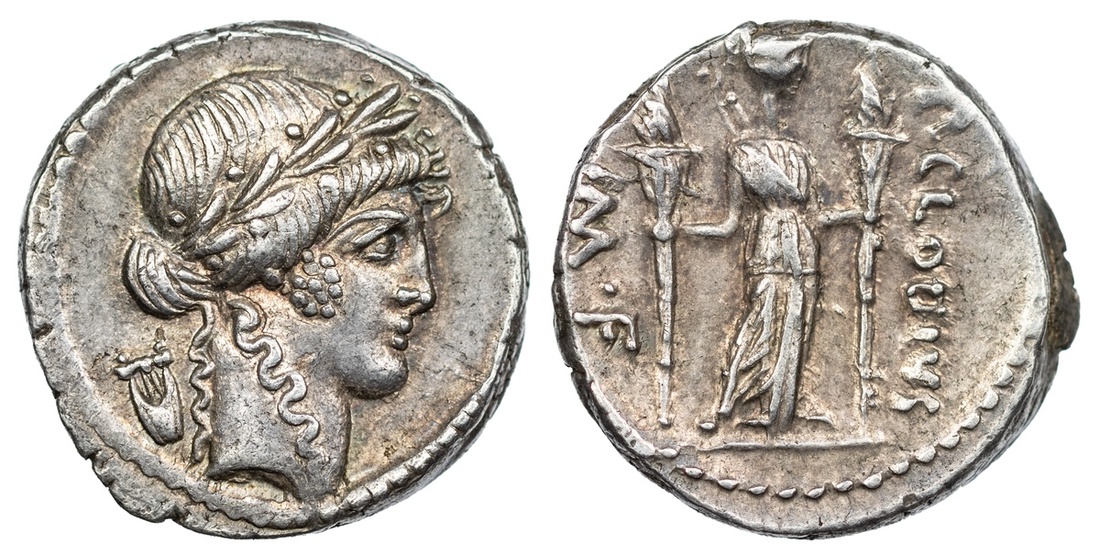 Roman Republic, P. Clodius M. f. Turrinus, AR Denarius, struck c. 42 BC, laureate head of Apollo right, wearing hair in knot, falling in two locks, lyre behind, rev. P. CLODIVS to right, .M. F to left, Diana Lucifera standing facing, head right, holding lighted long torch in each hand, bow and quiver on her shoulder, 4.07g (Crawford 494/23; CRI 184; Sydenham 1117; Kestner 3724-3728; BMCRR Rome 4291; Claudia 15), toned, slightly off-centre to reverse but otherwise about extremely fine