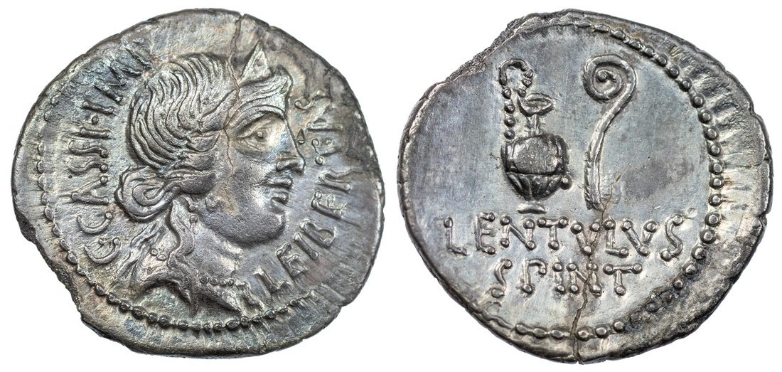Roman Republic, C. Cassius Longinus, with P. Lentulus Spinther, Legate, AR Denarius, Military Mint Travelling with Brutus and Cassius, probably at Smyrna, struck early 42 BC, C CASSI IMP LEIBERTAS, diademed head of Libertas right, rev. emblems of the augurate: capis and lituus, LENTVLVS SPINT below, 3.58g (Crawford 500/7; Sydenham 1310), lovely golden-blue tone, detailed, well-centred, flan crack to 12 o'clock, but otherwise lovely and about extremely fine
