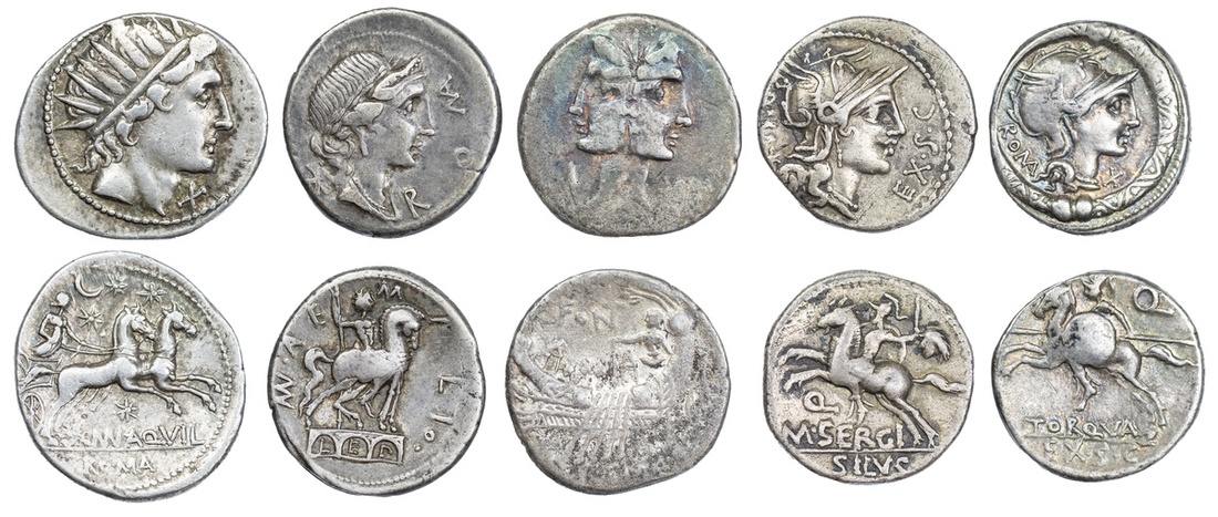 Roman Republic, Selection of Denarii (5): i) M. Sergius Silus, 116-115 BC, 3.77g (Crawford 286/1; Sydenham 534), good fine to very fine; ii) C. Fonteius, c. 112 BC, laureate head of beardless Janus, star to right, rev. C FONT above galley under oar left, filleted stern, ROMA below, 3.78g (Crawford 290/1; Sydenham 555), good to fine; iii) L. Manlius Torquatus, c. 113-112 BC, head of Roma right, wearing winged helmet, X before, all within decorated torque, rev. warrior on horseback galloping left, holding spear and shield, Q to upper right, L TORQVA below, EX S C in exergue, 3.92g (Crawford 295/1; Sydenham 545), good fine to very fine; iv) Man. Aemilius Lepidus, c. 114-113 BC, laureate, diademed and draped bust of Roma right, ROMA before, star behind, rev. MN AEMILIO, equestrian statue right on pedestal with three arches, L E P between the arches, 4.09g (Crawford 291/1; Sydenham 554), near very fine; v) Man. Aquilius, c. 109-108 BC, radiate head of Sol right, rev. MN AQVIL, Luna driving fast biga right, crescent and three stars above, one star below, ROMA in exergue, 3.97g (Crawford 303/1; Sydenham 557), near very fine (5)