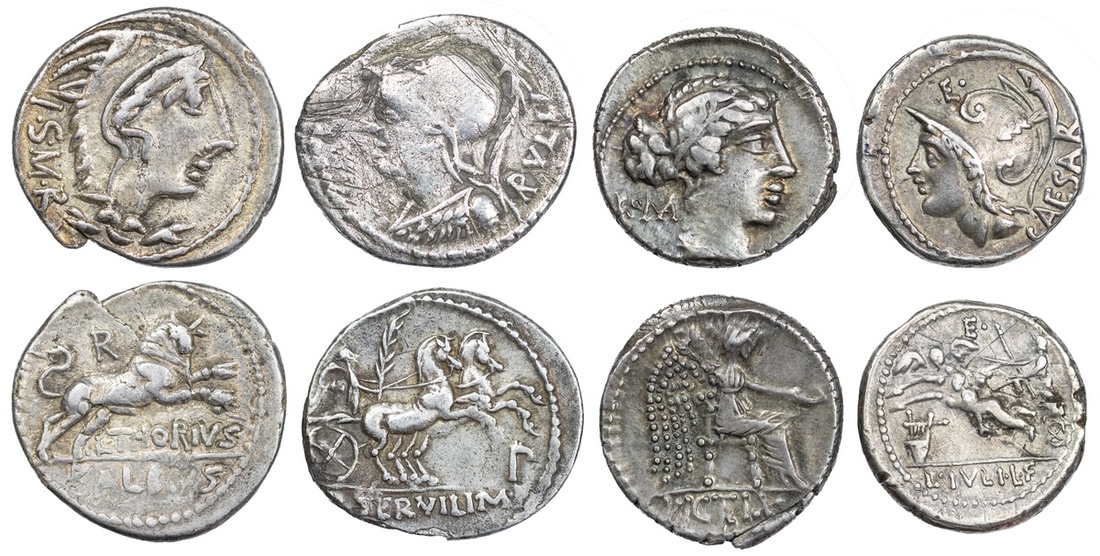 Roman Republic, Selection of Denarii (4): i) P. Servilius M. f. Rullus, c. 100 BC, RVLLI, armored and helmeted bust of Minerva left, wearing aegis, rev. Victory driving fast biga right, holding reins and palm, P to lower right, P SERVILI M F in exergue, 3.40g (Crawford 328/1; Sydenham 601), scratched, good to fine; ii) L. Julius L. f. Caesar, 103 BC, CAESAR, head of Mars left, wearing crested winged helmet, rev. L IVLI L F, Venus driving biga of cupids left, E above, lyre left, F above, 3.15g (Crawford 320/1; Sydenham 593), good fine to very fine; iii) M. Portius Cato, c. 89 BC, female bust right, ROMA behind, [M CATO] below, rev. Victory seated right, holding patera and palm, VICTRIX in exergue, 4.05g (Crawford 343/1c; Sydenham 596a), off-centre but very fine; iv) L. Thorius Balbus, 105 BC, ISMR, head of Juno Lanuvium right, clad in goat skin, rev. Bull charging right, R above, L THORIVS below, BALBVS in exergue, 3.82g (Crawford 316/1), cut to edge, about very fine; (4).