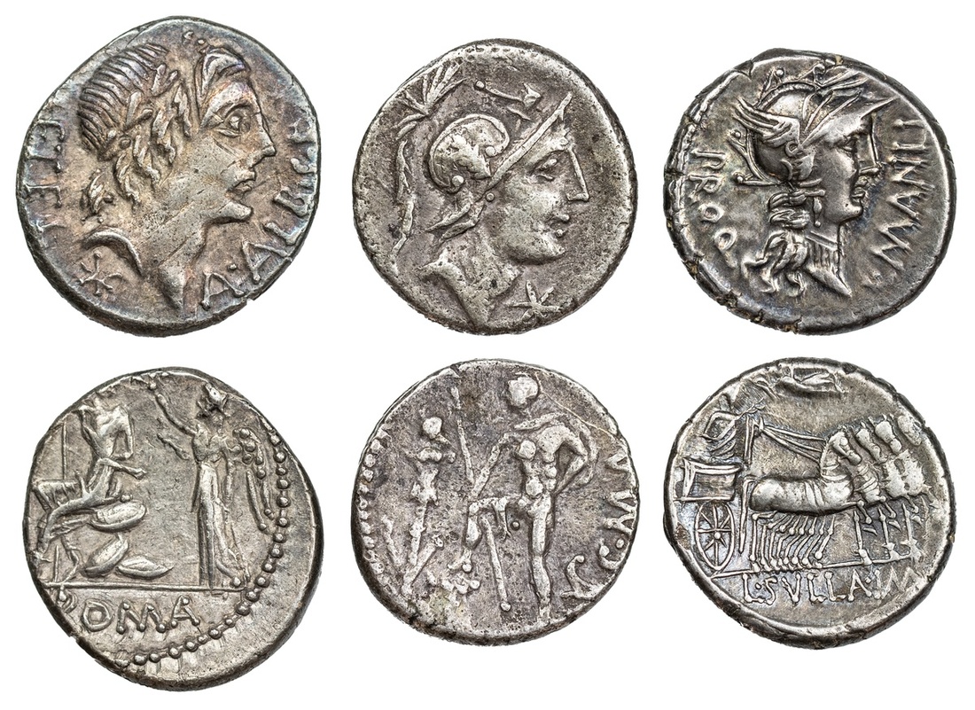 Roman Republic, a Trio of Denarii (3): i) C. Poblicius Malleolus, struck 91 BC, head of Mars right, wearing helmet with hammer above, * before chin, rev. C, MAL, naked warrior standing left, holding spear and placing right foot on cuirass, trophy to left field, prow to right, 3.86g (Crawford 335/3b), good fine or thereabouts; ii) C. Malleolus, A. Albinus Sp.f., and L. Caecilius Metellus, struck 96 BC, A ALB S F L METEL, laureate head of Apollo right, * below neck, rev. C. MALL, Roma seated left upon pile of shields, holding spear and parazonium, being crowned by Victory to right, standing left, ROMA in exergue, 3.99g (Crawford 335/1b; Sydenham 611a), struck slgihtly off-centre to reverse, otherwise toned and good fine to very fine; iii) L. Sulla and L. Manlius Torquatus, mint moving with Sulla in Italy, struck 82 BC, L MANLI PROQ, head of Roma right, wearing winged helmet, rev. Sulla driving slow quadriga right, Victoria flying left above, crowning him with wreath held in right hand, 3.88g (Crawford 367/5; RBW 1386; Sydenham 757), toned, struck on a slightly short flan with peripheral die-wear, otherwise good very fine