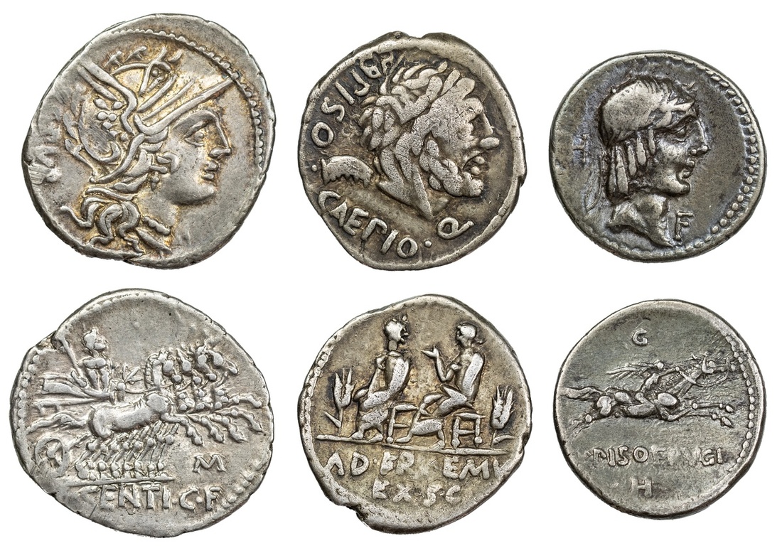 Roman Republic, Trio of Denarii (3): i) L. Calpurnius Piso L. F. Frugi, struck c. 90 BC, laureate head of Apollo right, F before, H behind, rev. horseman galloping right, holding palm frond and reins, G above, L PISO FRVGI below, H in exergue, 3.88g (Crawford 340/1; Calpurnia 11; Roma 8, lot 856 (dies)), toned, good fine to very fine; ii) Q. Servilius Caepio, with Calpurnios Piso Caesoninus, struck 100 BC, PISO CAEPIO Q, laureate and bearded head of Saturn right, rev. two male figures seated on subsellium looking towards one another and conversing, grain ear to either side, AD FRV EMV below, EX SC in exergue, 3.77g (Craford 330/1b; Sydenham 603a), fine to good fine; iv) L. Sentius C. f., struck 101 BC, ARG PVB, head of Roma right, wearing winged helmet decorated with griffin, rev/ Jupiter driving galloping quadriga right, sceptre in right hand, thunderbolt and reins in left, M below horses, 4.02g (Crawford 325/1b), toned, very fine; (3).