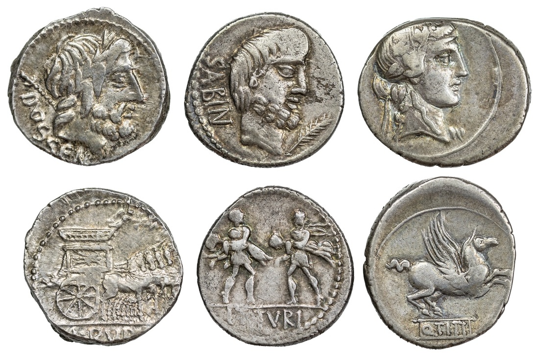 Roman Republic, Trio of Denarii (3): i) Q. Titius, struck c. 90 BC, head of Bacchus (or Liber) right, wearing ivy wreath, rev. Pegasus springing right from inscribed tablet, Q. TITI in exergue, 3.93g (Crawford 341/2), toned, good fine; ii) L. Titurius L. f. Sabinus, struck c. 89 BC, SABIN A PV, head of King Tatius right, rev. abduction of the Sabine women: two Roman soldiers, facing one another, each carrying off a Sabine woman in his arms, L TITVRI in exergue, 3.79g (Crawgord 344/1c), toned, smooth reverse but otherwise about very fine; iii) L. Rubrius Dossenus, DOSSEN, laureate head of Jupiter right, sceptre behind, rev. triumphal quadriga right, side-panel decorated with thunderbolt, Victory flying right above, holding wreath, L RVBRI in exergue, 3.96g (Crawford 348/1), toned, very fine (3).