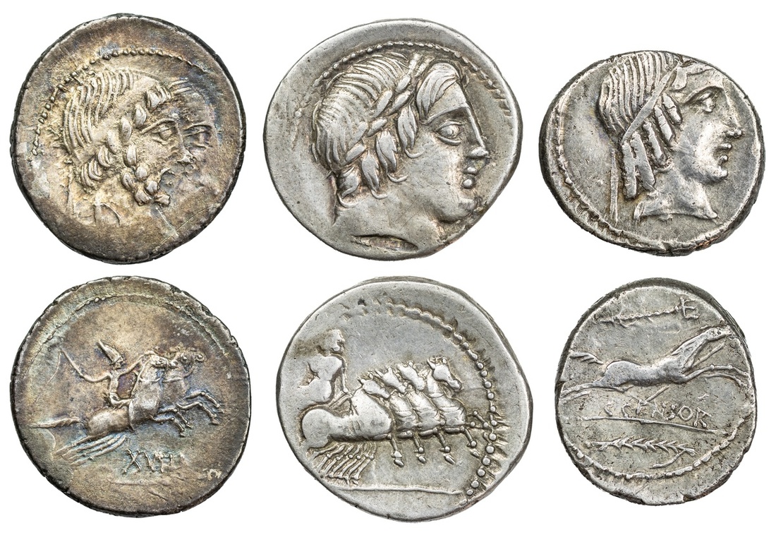 Roman Republic, Trio of Denarii (3): i) C. Censorinus, struck 88 BC, jugate, diademed heads of Numa Pompilius and Ancus Marcius, rev. two horses galloping right, desultor riding one horse, preparing to to mount the second, wearing conical hat and holding whip, XVIII below, C CENSO in exergue, 3.65g (Crawford 346/1a; Sydenham 713f), toned, worn, near very fine; ii) C. Marcinus Censorinus, struck 88 BC, diademed head of Apollo right, rev. horse galloping right, trident above, C CENSOR below, palm branch tied with fillet in exergue, 3.74g (Crawford 346/2b; Sydenham 714c), toned, good fine; iii) Anonymous, struck 86 BC, laureate head of Apollo right, rev. Jupiter driving quadriga right, brandishing thunderbolt, 3.99g (Crawford 350a/2; Sydenham 723), good fine to very fine; (3)