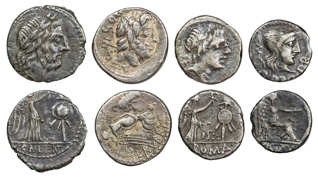 Roman Republic, a Quintet of Quinarii (4): i) L. Rubrius Dossenus, struck 87 BC, 2.04g (Crawford 348/4), near very fine; ii) C. Lentulus Clodianus, struck c. 88 BC, 1.79g (Crawford 345/2), toned, fine; iii) Anonymous, struck c. 80-81 BC, 1.52g (Crawford 373/1b), about fine; iv) M. Porcius Cato, Africa, struck 47-46 BC, 1.62g (Crawford 462/2), near very fine; (4).