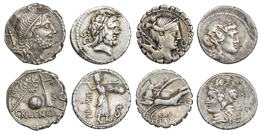 Roman Republic, a Quartet of Later Republican Denarii (4): i) L. Procilius, struck 80 BC, laureate head of Jupiter right, rev. Juno Sospita advancing right, 3.76g (Crawford 379/1), toned, good fine; ii) Ti. Claudius Ti.f. Ap.n. Nero, Serratus, struck 79 BC, draped bust of Diana right, rev. Victory driving galloping biga right, 3.70g (Crawford 383/1), good fine; iii) L. Cassius Q.f. Longinus, struck 75 BC, head of Liber (or Bacchus) right, thyrsus over shoulder, rev. wreathed head of Libera left, 3.84g (Crawford 386/1; Sydenham 779), near very fine; iv) Cn. Lentulus, Spanish mint(?), struck c. 76-75 BC, diadmed and draped bust of Genius Populi Romani right, sceptre over shoulder, rev. sceptre with wreath, globe and rudder, EX-SC across fields, CN LEN Q below, 3.87g (Crawford 393/1a; Sydenham 752), some scuffs to portrait, toned, very fine; (4).