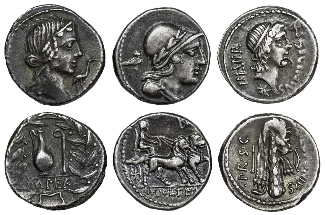 Roman Republic, a Trio of Later Republican Denarii (3): i) Q. Caecilius Metellus Pius, struck c. 81 BC, diademed head of Pietas right, stork before, rev. jug and lituus, IMPER in exergue, all within laurel border, 3.93g (Crawford 374/2; Sydenham 751; RBW 1397), dark tone, very fine; ii) M. Volteius M. f., struck 78 BC, laureated, draped and helmeted bust of Attis right, owl standing right behind, rev. Cybele, wearing turreted crown and veil, holding reins and patera, driving biga of lions right, KA above, M VOLTEI M F in exergue, 4.35g (Crawford 385/4), very fine; iii) Q. Sicinius and C. Coponius, Military mint in the East, moving with Pompey, diademed head of Apollo right, star below, rev. club of Hercules surmounted by lion skin and scalp, arrow to left, bow to right, 4.15g (Crawford 444/1a; Sydenham 939; RBW 1558), test cut to obverse, smoothing to inscriptions, otherwise very fine; (3).