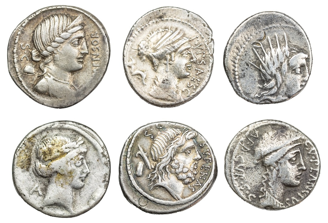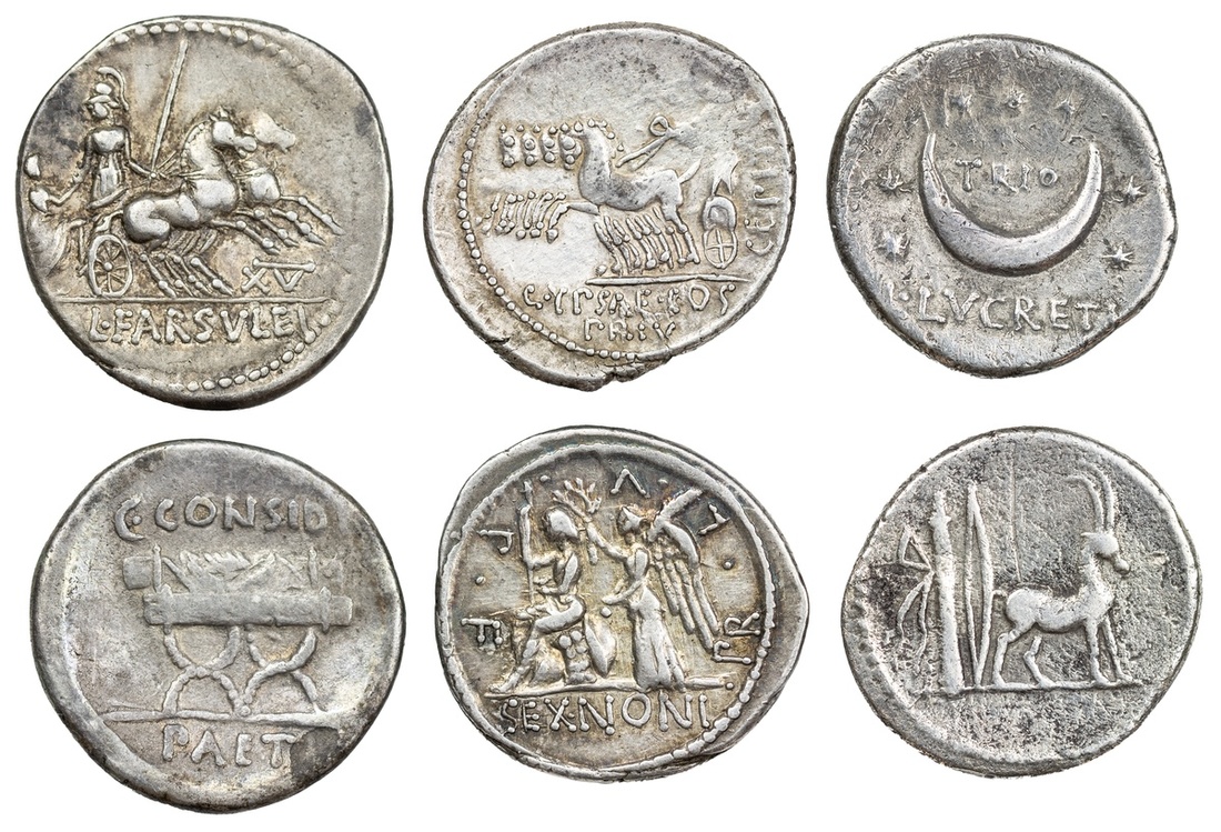 Roman Republic, Selection of Late Republican Denarii (6): i) L. Lucretius Trio, struck 76, radiate head of Sol right, rev. crescent and seven stars, 3.93g (Crawford 393/1), fine; ii) L. Farsuleius Mensor, struck 76, diademed and draped bust of Libertas right, SC behind, rev. Warrior, standing facing, assiting togate figure into a biga, while holding spear and reins, XV below, 3.85g (Crawford 392/1b; Sydenham 789), very fine; iii) M. Nonius Sufenas, struck 59, head of Saturn right, harpa and conical stone behind, rev. Roma seated left on pile of arms, holding sceptre and sword, Victory standing left behind her, crowning her with wreath, while holding palm frond, 3.80g (Crawford 421/1; Sydenham 885), toned, very fine; iv) L. Plautius Hypsaeus, 57, diadmed and draped bust of Leuconoë right, snake behind, rev. Jupiter driving quadriga left, holding reins and thunderbolt, 3.72g (Crawford 420/2a; Sydenham 911; RBW 1515), about very fine; iv) Cn. Plancus, struck 55, female head, wearing causia, right, rev. Cretan goat standing right, bow and quiver behind, 3.70g (Crawford 432/1; Sydenham 933; RBW 1541), good to fine; vi) T. Considius Paetus, struck 46, laureate head of Apollo right, A behind, rev. C. CONSIDIVS, curule chair on which lies wreath, PAET[VS] in exergue, 3.40g (Crawford 465/1a; Sydenham 990), good to fine; (6).