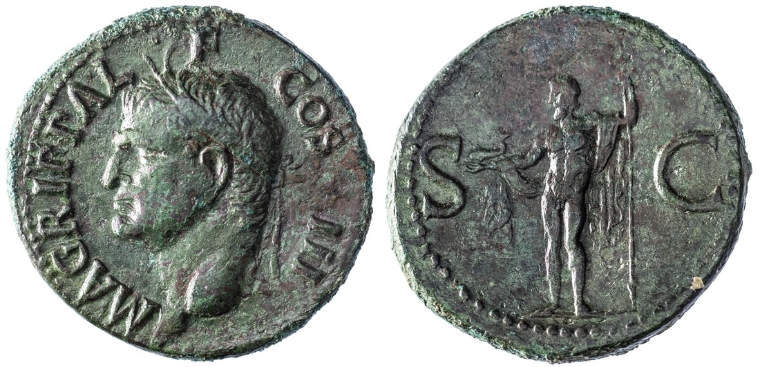 Roman Empire, Agrippa, AE As, struck under Augustus (27 BC-AD 14), M AGRIPPA L F COS III, bare head left, rev. Neptune standing left, wearing causia and holding trident, S-C across fields, 11.93g, 12h (RIC 58; Cohen 3), slight roughness to edges, nice green patina, good very fine