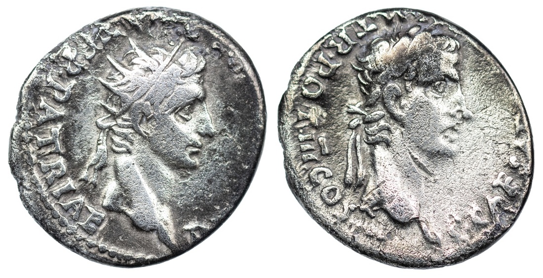 Roman Empire, Caligula (AD 37-41), AR Denarius, Lugdunum, struck c. 40, C CAESAR [AVG PON] M TR POT III COS [III], laureate head of Caligular right, rev. DI[VVS AVG] PATER PATRIAE, radiate head of Augustus right, 3.00g (RIC 24; BM 32; Giard, Lyon 177; cf. Gorny 297, lot 1476 (obverse); cf. CNG 438 lot 463 (reverse)), struck slightly off-centre to reverse, with some wear to edge inscriptions, nevertheless rare and very fine