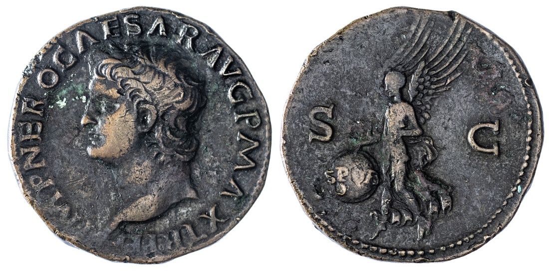 Roman Empire, Nero (AD 54-69), AE As, NERO CLAVD CAESAR AVG GER P M TR P IMP P P, bare head left, with globus at point of neck, rev. Victory flying left with shield, inscribed SPQR, 10.76g (RIC 478), slightly softened to higher points, but nicely detailed, spot of verdigris and a light patina, good fine or better
