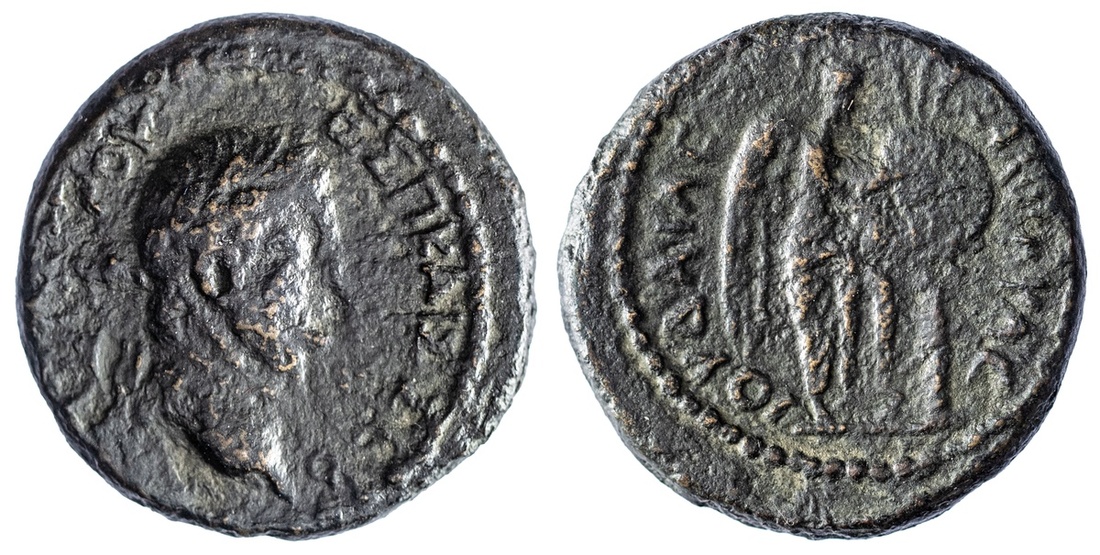 Roman Judaea, Vespasian (AD 69-79), AE 19, Caesarea Maritima, laureate head right, rev. Nike standing right, writing on shield upon palm tree, 6.82g (Hendin 742; AJC 1), light patina, slight off-strike to obverse, otherwise about very fine, rare