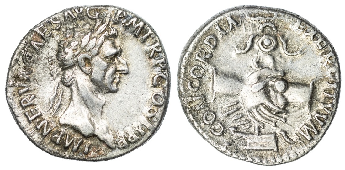 Roman Empire, Nerva (AD 96-98), AR Denarius, Rome, struck 96, IMP NERVA CAES AVG P M TR P COS III P P, laureate head right, rev. CONCORDIA EXERCITVVM, clasped hands before a military standard, 3.35g (RIC 15), good very fine