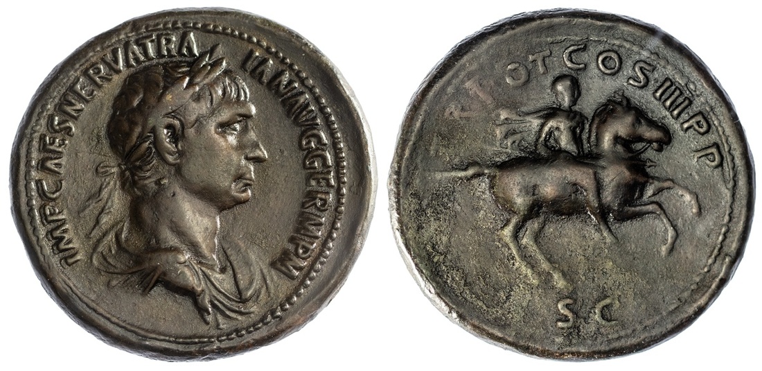 Roman Empire, Trajan (AD 98-117), AE Sestertius, Rome, struck 101-102, IMP CAES NERVA TRAIAN AVG GERM P M, laureate, draped and cuirassed bust right, rev. TR POT COS IIII P P, Trajan riding horse right, holding reins and spear, 35.30g (RIC 418a; Strack 330; Woytek 79g this coin mentioned), slight double-strike, possible smoothing to reverse, good fine to very fine