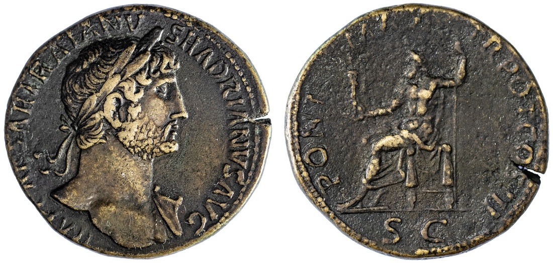 Roman Empire, Hadrian (AD 117-138), AE Sestertius, Rome, 119-120, IMP CAESAR TRAIANVS HADRIANVS AVG, laureate bust right, drapery at far shoulder, rev. PONT MAX TR POT COS III / S C, Jupiter enthroned left, holding Victory in his right hand and a sceptre in his left, SC in exergue, 26.83g (RIC 249 (formerly 561a); BMC 1146; Strack 533; Banti 599), light patina, lustrous obverse, nice portrait, reverse slightly weak, cut to three o'clock, very fine