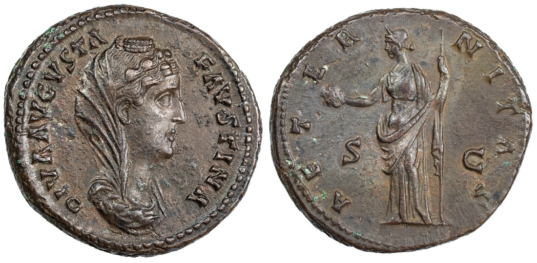 Roman Empire, Faustina the Elder, struck under Antoninus Pius (AD 138-161), AE As or Dupondius, Rome, DIVA AVGVSTA FAVSTINA, draped and veiled bust right, rev. AETERNITAS, Providentia standing left, draped and holding globe and sceptre, 11.98g (RIC 1163a; Cohen 38 var. (no veil)), light deposits, good very fine to extremely fine