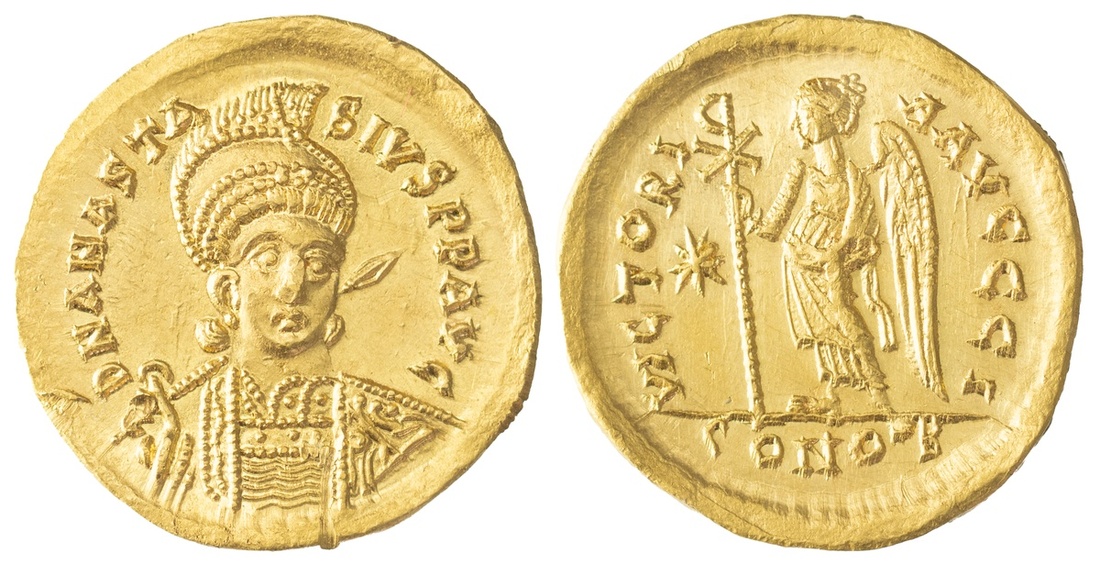 Byzantine Empire, Anastasius (491-518), AV Solidus, Constantinople, 10th Officina, struck c. 498-518, D N ANASTASIVS P P AVG, helmeted, pearl-diademed and cuirassed bust facing slightly right, holding spear over his right shoulder in his right hand and with a shield, decorated with a horseman spearing fallen foe, on his left shoulder, rev. VICTORIA AVGGG I, Victory standing left, holding jewelled cross surmounted with reversed christogram, star to left field, CONOB in exergue, 4.40g (SB 4; MIBE 6a), extremely fine