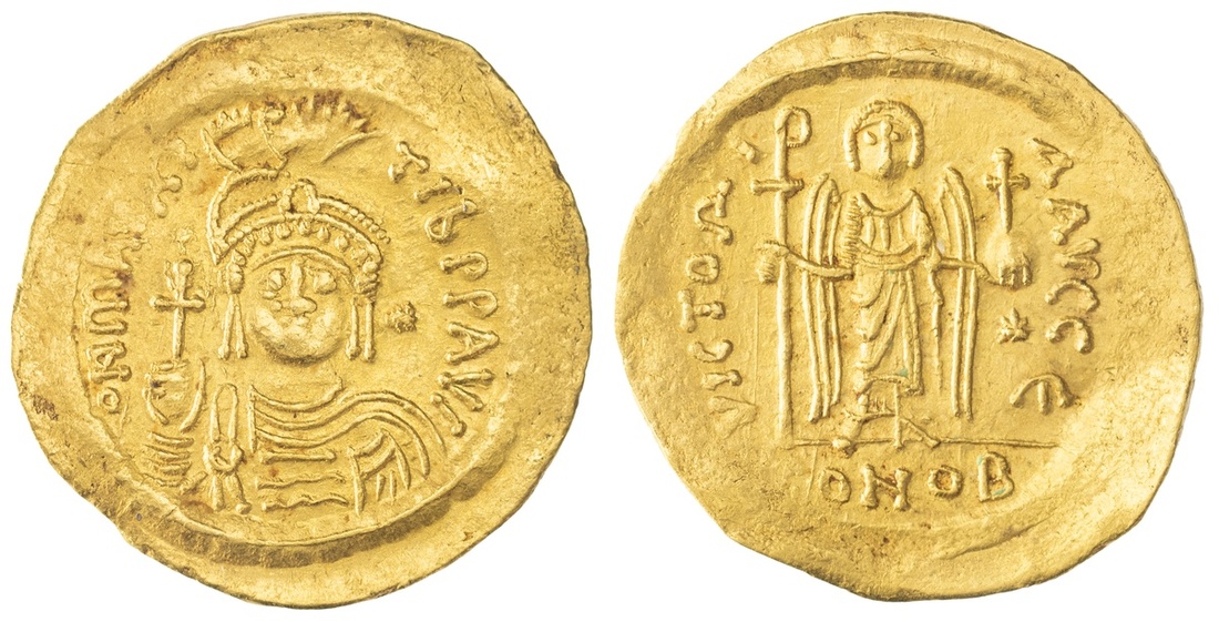 Byzantine Empire, Maurice (582-602), AV Solidus, Constantinople, 5th Officina, struck c. 583-602, d N mAVRC TIb P P AVG, crowned, draped and cuirassed bust facing, rev. VICTORIA AVGG E, Angel standing facing, holding staff topped with Christogram in his right hand, and a globus cruciger in his left, CONOB in exergue, 4.28g (DOC 5e; MIBE 6; SB 478), flattened to edges, otherwise very fine