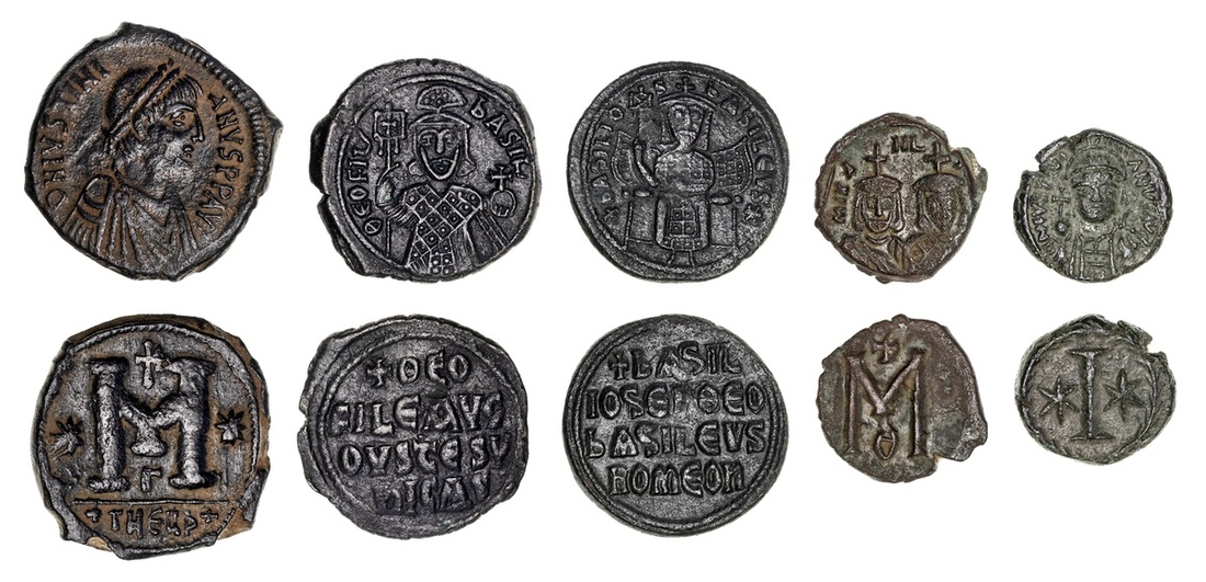 Byzantine Empire, a Selection of Bronze (5): Justinian I, 'the Great' (527-565) (2): i) Follis, Theoupolis (Antioch), 533-537, D N IVSTINIANVS P P AVG, pearl-diademed, draped and cuirassed busts right, rev. large M, stars across fields, cross above, G below, +THEUPH+ in exergue, 14.95g (SB 216; DOC 210c; MIB 126), light patina, very fine to good very fine; ii) 10 Nummi, Rome or Ravenna, c. 547-549, helmeted and cuirassed facing bust, holding globus cruciger and shield, rev. large I, star to left and right fields, all within wreath, 5.54g (MIBE 228; DOC 331; SB 308), porous, fine; iii) Basil I (879-886), Follis, Constantinople, BASILIO BASILEUS, Emperor enthroned facing, on lyre-backed throne, wearing loros, holding labarum and akakia, rev. +bASIL/IOS Eh THEO/bASILEVS/ROmEOn, in four lines, 6.55g (DOC 12; SB 1709), very fine; iv) Michael II, 'the Amorian', with Theophilus (820-829), Follis, Syracuse, 821-829, MIKA-HL [...] crowned busts of Michael, on the left, wearing chlamys, and Theophilus, on the right, wearing loros, facing, pellet between their heads, rev. large M, cross above, T below, 3.79g (DOC 21; SB 1652; Anastasi 513; Spahr 399), light patina, fine; v) Theophilus (829-842), Follis, Constantinople, THEOFIL BASIL, three-quarter length figure of Theophilus standing facing, wearing crown surmounted by tufa, holding labarum in his right hand and globus cruciger in his left, rev. +THEO/FILE AVGOUS TE SV/NICAS, in for lines, 8.36g (DOC 15; SB 1667), detailed, very fine; 95).