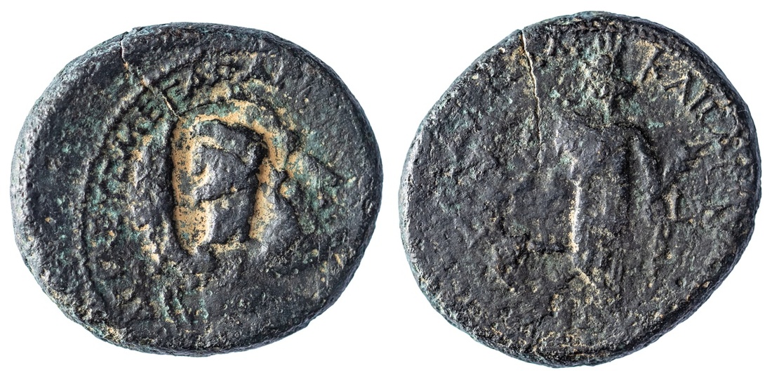 Kingdom of Judea, Agrippa I (AD 37-43), AE 22, dated Year 7 (AD 43), diademed and draped bust of Agrippa right, c/m: male head in oval left, rev. Tyche standing left, holding rudder in right hand, palm in left, 7.78g (AJC II pg. 262, 27; Hendin 555; RPC 4985; Howgego 156 (for countermark)), nice patina, good fine, immensely rare