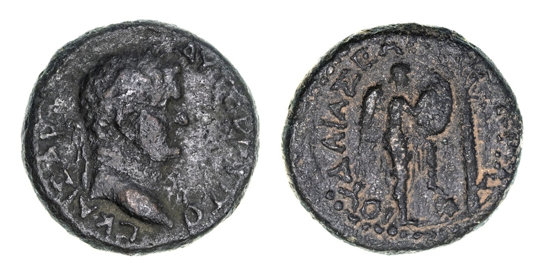 A Selection of Judean Bronze from Mattathias to Domitian (4): i) Kingdom of Judea, Mattathias Antigonus (40-37 BC), AE 8 Prutot, 'Mattatayah the High Priest and Council of the Jews' (Hebrew), around and between horns of a double cornucopiae, rev. 'of King Antigonus' (Hebrew), ivy wreath tied at top with ribbons hanging down, 13.10g (Hendin 481; Meshorer 30), softened, fine; ii) Roman Judaea, First Revolt (AD 66-70) AE 1/8 Shekel, dated year 4 (69/70), 'To the redemption of Zion' (Paleo-Hebrew), chalice with pearled rim, rev. 'Year four' (Paleo-Hebrew), lulav branch flanked by an etrog on either side, 5.09g (Hendin 1369; TJC 214), softened, fine to good fine; iii) Titus, as Caesar (AD 69-79), AE 17, 'Judaea Capta' issue, Caesarea-Maritima, struck c. 71-73, AYTOKR TITOS KAISAR, rev. IOYDAIA EALUKLIAS, Nike standing right, inscribing shield attached to palm tree, 7.53g (TJC 381; Hendin 1446; RPC 2311; Howgego 135), porous portrait, but a detailed reverse with a nice patina, good fine to very fine; Domitian (AD 81-96), AE, 'Judaea Capta', Caesarea Maritima, under Agrippa II, struck c. 81-82, IMP DOMITIANVS CAESAR DIVI F AVG, laureate head right, rev. rudder, 1.43g (Hendin 754; AJC 4; TJC 389; RPC II 2303), very fine; (4)
