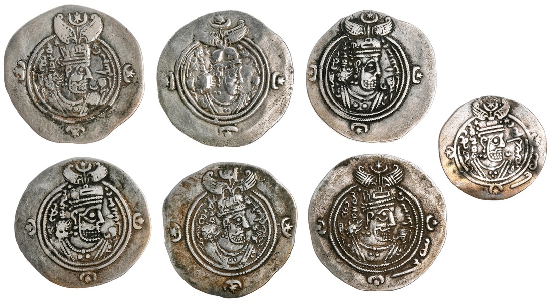 Sassanid Persia, Silver of Khusru II (7) all with crowned bust right, rev. fire-altar with attendants, unless specified i) Year 25, 3.48g; ii) Year 31, Bishapur Mint, 3.93g; iii) Year 14, Gurgan Mint, 4.13g; iv) Year 29, Nivahand Mint, 1.88g; v) Year 16, Bishapur Mint, 4.08g; vi) Year 34, Hamadan Mint, 4.08g; vii) Tabaristan Mint, 3.94g, ranging from about very fine to good very fine; (7).