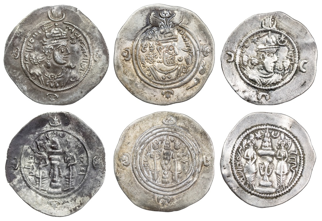 Sassanid Persia, a Trio of Drachmae (3): i) Khosrow I (AD 531-579), Veh Kavad mint, dated RY 27 = AD 556/7, crowned bust right, with portrait flanked by star and star above crescent, rev. fire altar flanked by attendants, star and crescent, 4.12g, very fine; ii) Khosrow II (AD 590-628), 'DL' mint, dated RY 27 = AD 617/18, crowned bust right, wearing mural crown, rev. as before, iii) Ardashir III (AD 628-630), dated RY 2 = AD 629-630, crowned bust right, ribbon over right shoulder, crescent over left, rev. fire altar flanked by attendants, ribbon star and crescent surrounding the flames, RY to left, mint to right, 4.15g (Göbl I/1), very fine, nice find patina; (3).