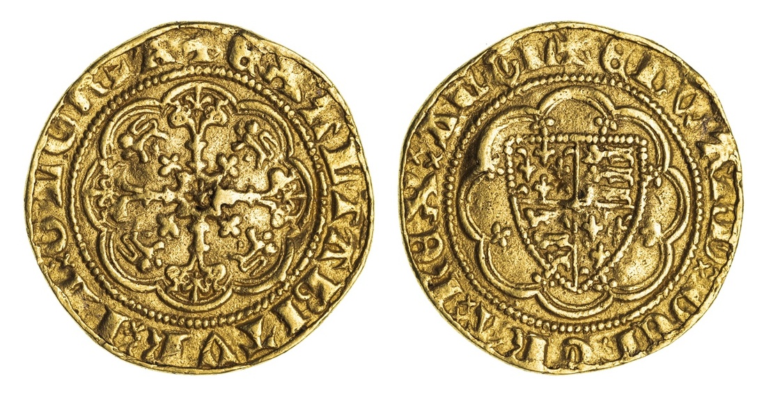 (x) Edward III (1327-1377), Fourth Coinage, Treaty Period, Quarter-Noble, 1361-1369, London, EDWARD : DEI : GRA : REX : AnGL, double saltire stops, shield in tressure of eight arcs, rev. + EXALTABITVR : In : GLORIA, lys in centre of floriate cross in tressure of eight arcs, lions and lis in angles, 1.81g [27.93grns], 10h, m.m. cross potent (Schneider I, 83-84; North 1243; S.1510), flan ever so slightly warped in some places, otherwise boldly struck and very fine