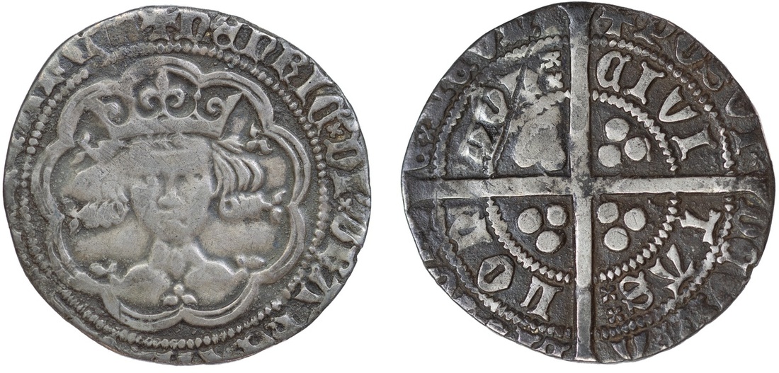 Henry V (1413-1422), Class B, Groat, London, crowned facing 'scowling' bust, rev. CIVITAS : LONDON :, long cross with trio of pellets in angles, 3.24g [50.00grns], 4h, m.m. pierced cross with pellet (North 1386; S.1762), short of flan and a scratch to the reverse, with a dark cabinet tone, a waterworn fine