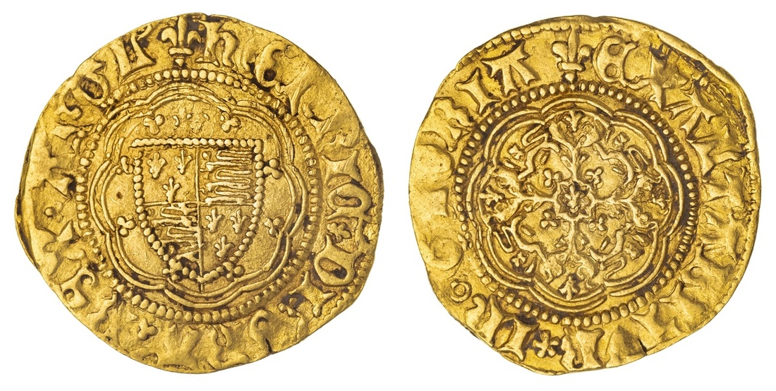 Henry VI, First Reign (1422-1461), Annulet Issue, Quarter-Noble, 1422-1427, London, (m.m) hENRIC ' (trefoil) DI •' GRA '• REX • ANGL ', trefoil stops, shield in tressure of eight arcs, lys above, rev. (m.m) EXALTABITVR * In • GLORIA, trefoil stop, mullet after EXALTABITVR, short cross fleury atop voided quatrefoil, trefoils on tips, lys in forks, leopards in angles, all in double tressure of eight arches, spandrels plain, 1h, 1.71g, m.m. lys (Schneider I, 295; North 1420; S.1810), deposits to recesses and softness to legends, very fine